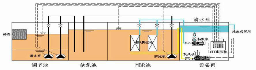 MBR是一种将高效膜分离技术与传统活性污泥法相结合的新型高效污水处理工艺,它用具有独特结构的MBR平片膜组件置于曝气池中,经过好氧曝气和生物处理后的水,由泵通过滤膜过滤后抽出。它利用膜分离设备将生化反应池中的活性污泥和大分子有机物质截留住,省掉二沉池。活性污泥浓度因此大大提高,水力停留时间(HRT)和污泥停留时间(SRT)可以分别控制,而难降解的物质在反应器中不断反应、降解。