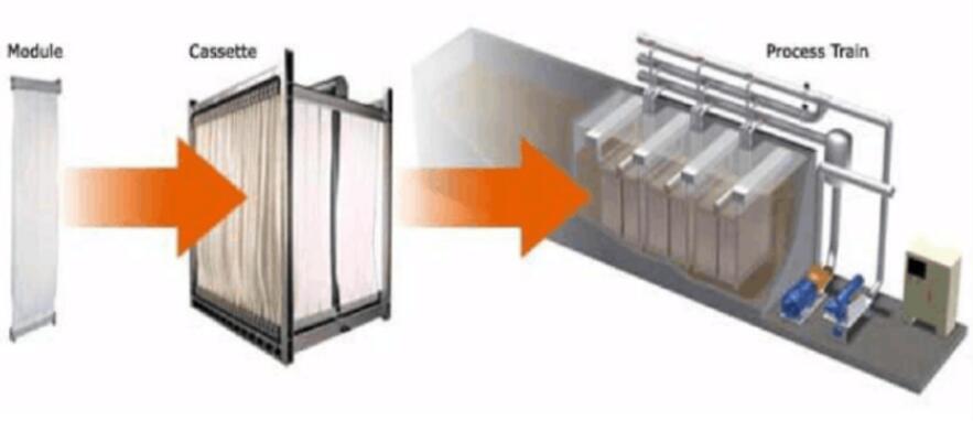 MBR膜生物反应器,是一类将高效膜分离技术与传统活性污泥法相结合的新型高效污水处理工艺,它用将其独特结构的MBR平板膜组件放置曝气池中,通过好氧曝气和生物处理后的水,由泵通过滤膜过滤后抽出。MBR污水处理与传统污水处理方法有着非常大区别,通过膜分离装置代替传统工艺中的二沉池和三级处理工艺。进而得到优质的出水,解决了传统环保设备进行污水处理的出水水质达不到中水回用要求的问题。MBR污水处理后的水可直接作为市政生活用水或进一步处理作各种工业用水。