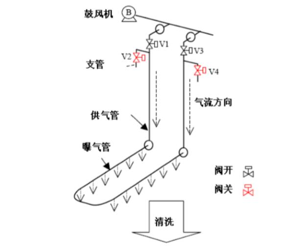 清洗时,通过打开排空气阀释放曝气管内的压力使污泥逆流进入曝气管内,通过流经曝气管内的空气将污泥排出。