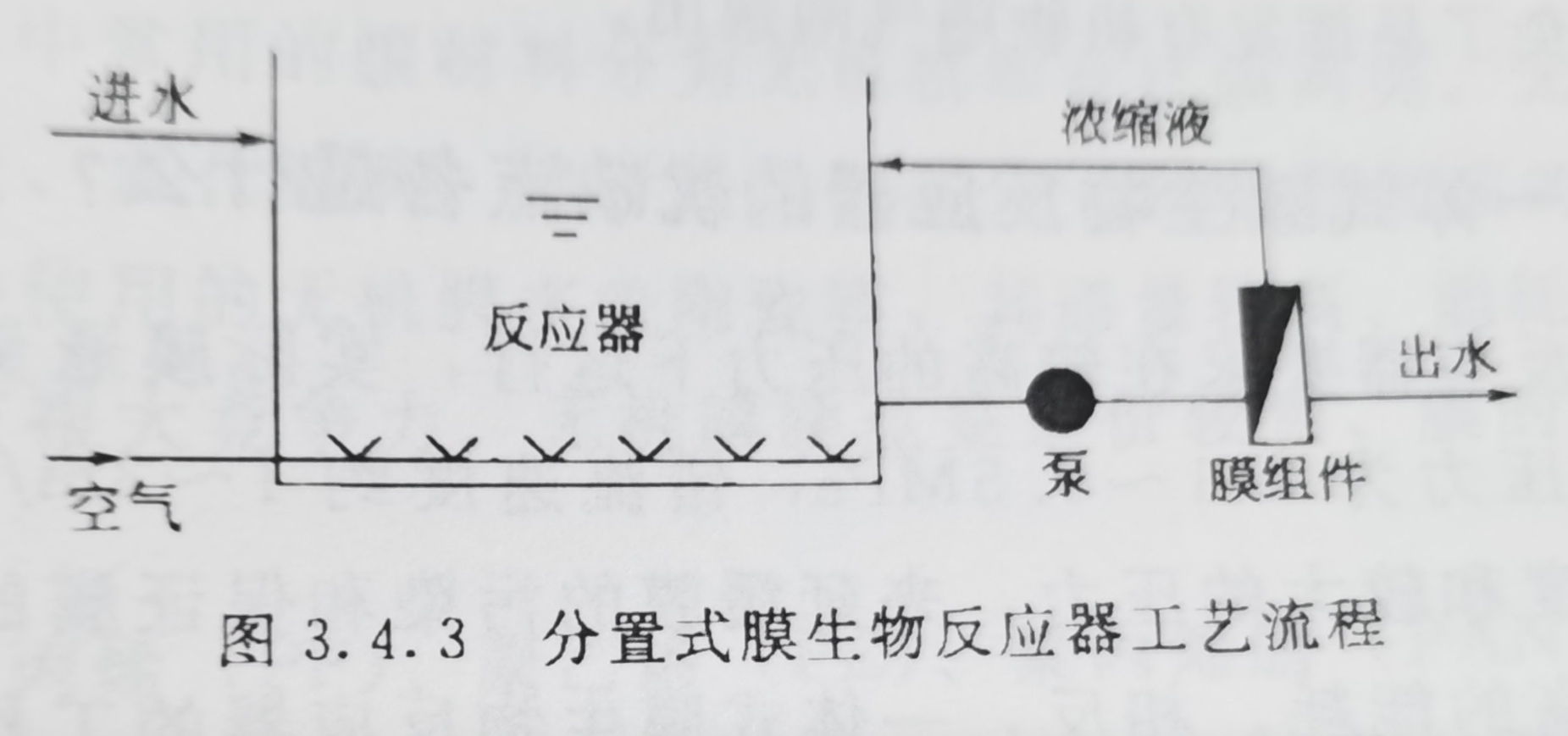 分置式膜生物反应器是将膜组件作为独立单元与生物反应器相分离,混合液由泵加压进入膜组件,膜组件的透过液即为系统的出水,而膜组件的浓缩液返回到反应器内。分置式膜生物反应器均采用错流式膜组件,即混合液平行于滤膜表面流动,与滤过液流向垂直。错流过滤产生较大的剪切力,可限制滤饼层的厚度,对缓解膜污染极为有效。为了维持稳定的透水率,膜面的错流流速一般要求大于2m/,这就需要较多的循环水量,使得单位产水的能耗较高。分置式膜生物反应器的膜通量较高,膜组件易于清洗和更换,运行稳定可靠。分置式膜生物反应器既能用于好氧处理,也能用于厌氧处理,其工艺流程如图