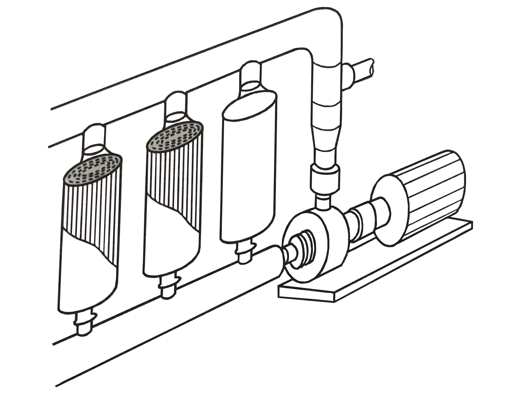 一般情况下,在一块场地里只能设置一个砂滤池,而膜过滤设施则可以将充填了大量膜的膜组件排列设置,以提高集成度(如图1所示)。可以通过使用各种膜组件达到平均1㎡设置面积有100~300㎡膜面积的程度。在这方面膜过滤与砂滤有很大不同。